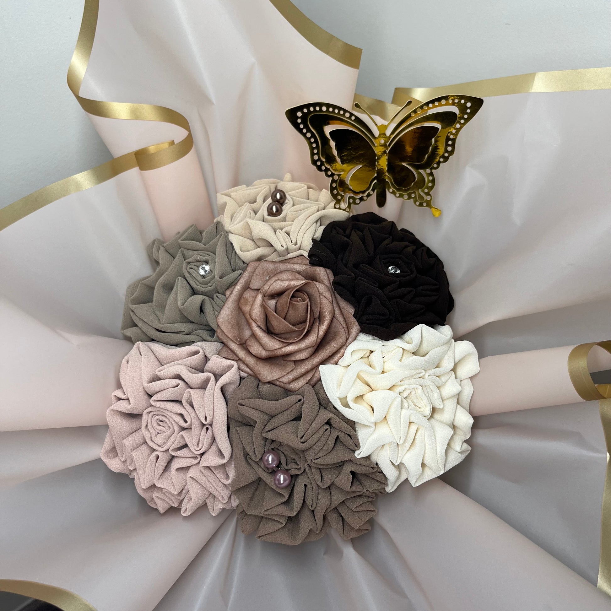 - Décoration : Le bouquet est soigneusement enveloppé dans un papier d'emballage élégant, agrémenté de motifs délicats et de papillons décoratifs.